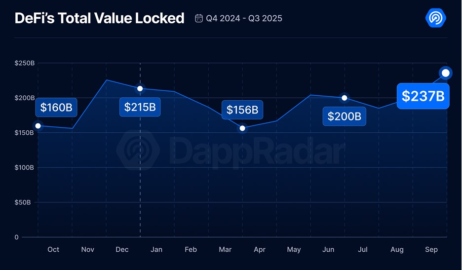 У звіті, надісланому Cointelegraph, Дапрадар заявив, що щоденні унікальні активні гаманці в середньому складали 18,7 мільйонів у кварталі, що знизилося на 22,4% порівняно з другим кварталом. Тим часом протоколи Defi колективно заблоковані в 237 мільярдів доларів, найвища загальна вартість заблокована (TVL), яку коли -небудь записували в просторі.