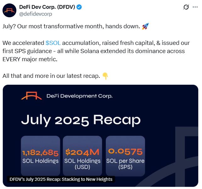 У понеділок Defi Development Corp заявив, що збільшила свої криптовалютні холдинги до понад 1,2 мільйона SOL, придбавши ще 110 466 токенів.