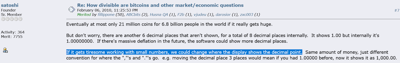 “Якщо він стане стомлюючим, працюючи з невеликою кількістю, ми можемо змінити, де на дисплеї показано десятковий пункт”, – сказав Сатоші у лютому 2010 року, перш ніж зникнути наступного року.