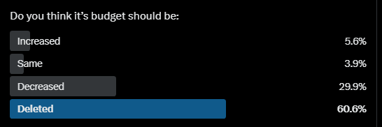 Результати опитування показали, що 60,6% респондентів хочуть видалити бюджет IRS, а 29,9% проголосували за зменшення бюджету.