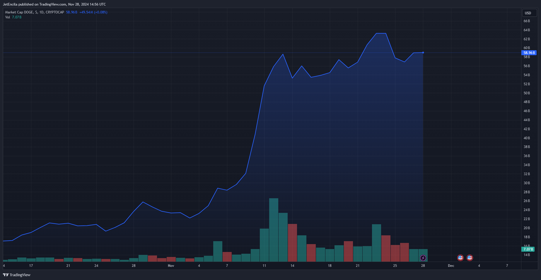 Ринкова капіталізація DOGE зараз становить 58,9 мільярда доларів. Графік: TradingView.com