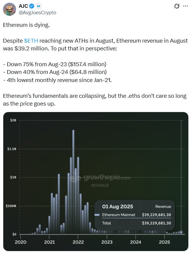У суботу в суботу, менеджер з досліджень Messari, AJC, заявив: “Основи Ethereum руйнуються”, оскільки дохід Ethereum від гонорарів у серпні становив 39,2 мільйона доларів, що перевищує 40% за рік і приблизно 20% місяця.