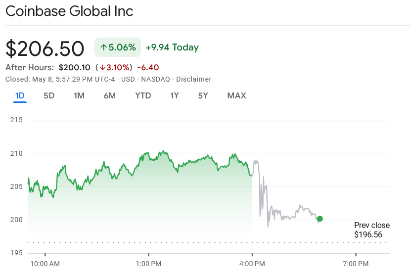 Угода Coinbase’s Deribit сприяла зростанню ціни акцій Coinbase (монети) на 5,1% протягом 8 травня, хоча акції повернули 3,1% у після години, оскільки обмін криптовалют опублікував свої результати Q1.