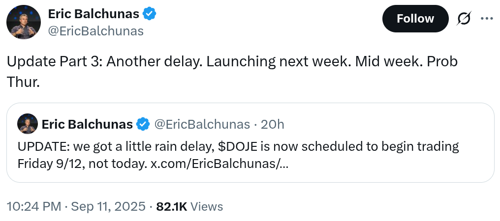 Тим не менш, Балчунас сказав, що очікує, що в жовтні чи листопаді запуститься чотири -п’ять ETF Dogecoin. Він сказав, що “чим більше запускає [догі ETF], тим більше він перемістить голку.