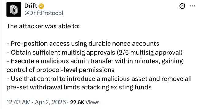 Дрифт сказав, що зловмисник використовував довгострокові небазовані, попередньо підписані транзакції, щоб отримати неавторизований адміністративний доступ і швидко виконати зловмисні дії після надсилання.