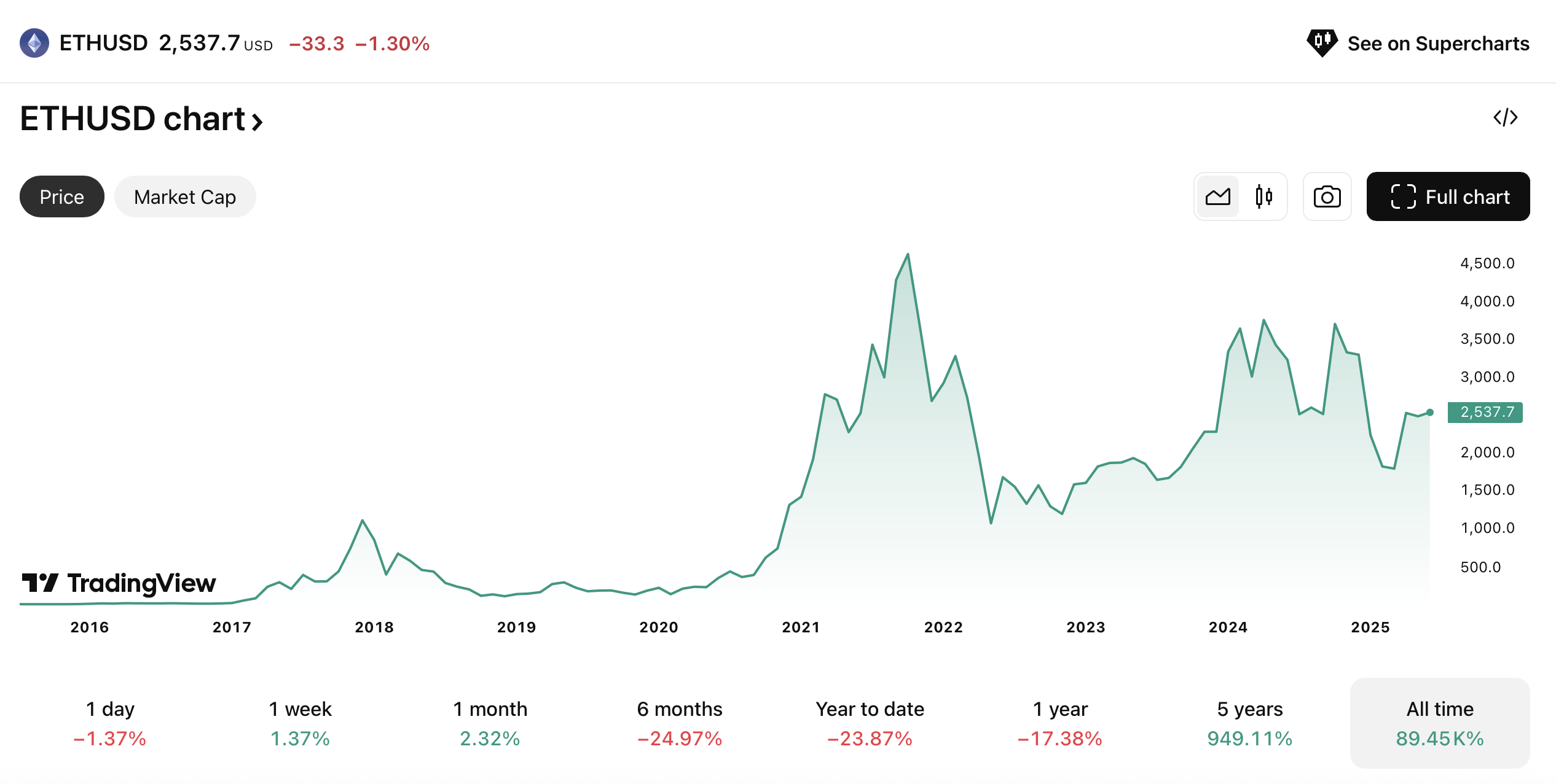 За даними TradingView, ETH оцінив 89 450% за майже 10 років, що гаманці залишаються в спокої.