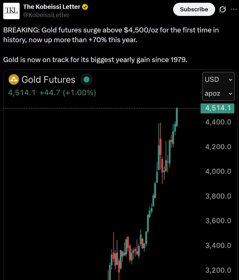 Нещодавно ф’ючерси на золото досягли нових історичних максимумів вище 4500 доларів за тройську унцію, продовжуючи річне підвищення, спричинене купівлею центрального банку, геополітичним ризиком і очікуванням можливого зниження процентної ставки. Для порівняння, біткойн (BTC) і ширші ринки криптовалюти спостерігали більш приглушену цінову дію за той самий період.