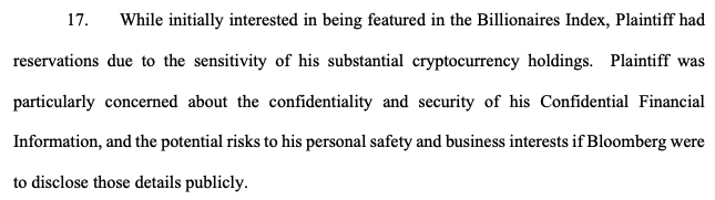 Сун погодився і йому було надано “явні запевнення”, що його фінансова інформація, “особливо пов’язана з його криптовалютами, буде проведена” суворо конфіденційною “, і Блумберг буде використовувати його лише для перевірки своєї чистої вартості, згідно з поданням.
