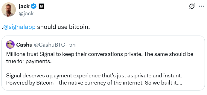 Декілька біткойнів, у тому числі Джек Дорсі, посилили свій поштовх до того, щоб додаток для обміну повідомленнями Signal, орієнтований на конфіденційність, перейняло біткойн через нову кампанію «Bitcoin for Signal», метою якої є інтеграція біткойна з протоколом Cashu для здійснення платежів у додатку.