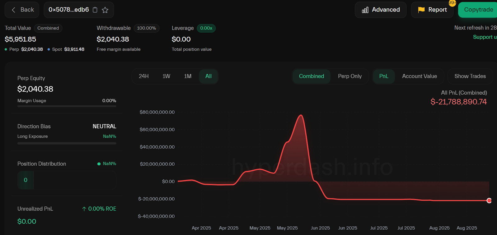 Тим не менш, Wynn здійснив загальну кількість збитків на 21,7 мільйона доларів на одному рахунку з 19 березня, коли він почав торгувати через Wallet 0x5078 на децентралізованій біржній гіперліциді, дані HyperDash показують.
