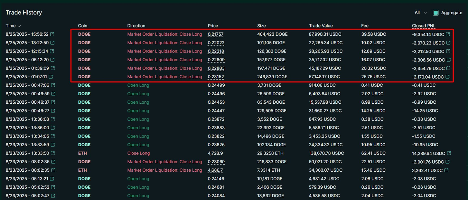 Вінн був ліквідований на своєму недавньому 10 -кратному вигідному становищі, яка ставилася на ставку на оцінку цін до Dogecoin (Doge), втрачала 22 627 доларів, згідно з даними платформи Blockchain Data Onchain в понеділок X Post.