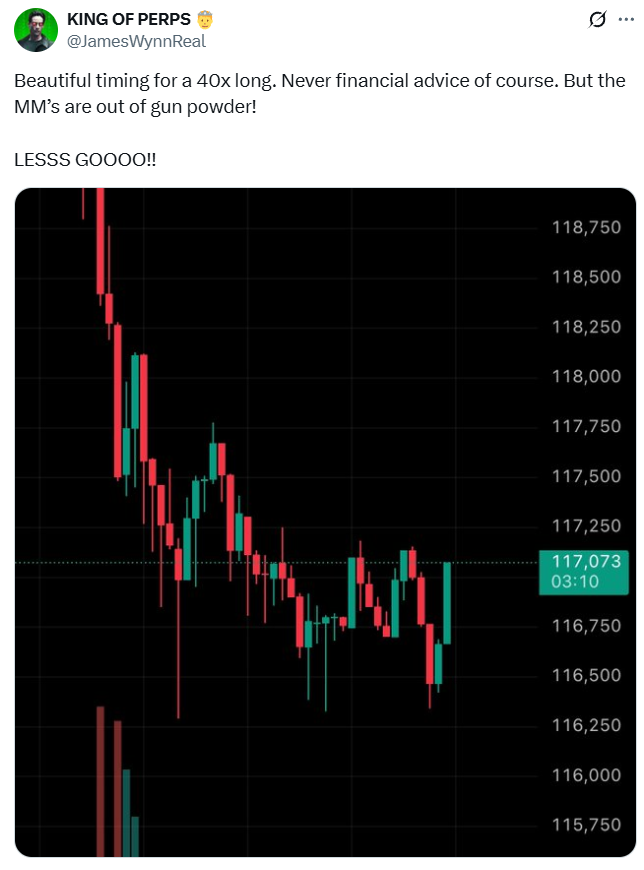 Вінн повернувся з двома новими позиціями з використанням, включаючи 40 -кратну позицію біткойна (BTC) на суму понад 19,5 мільйонів доларів при 117 000 доларів, що може бути ліквідовано, якщо ціна впала нижче 115 750 доларів. Wynn вже понесло плату за фінансування на суму 1,4 мільйона доларів США для збереження позиції, що має поточний нереалізований прибуток у розмірі 78 000 доларів.