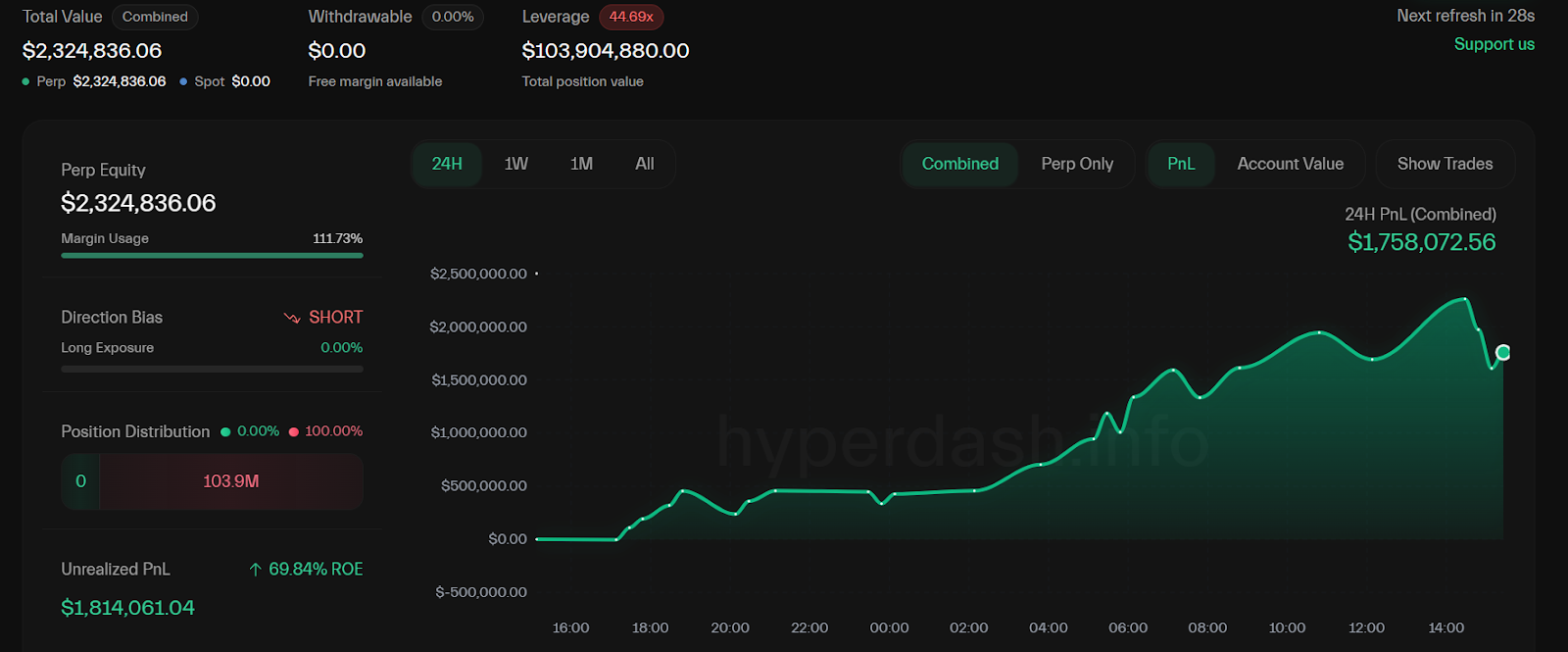 І все -таки не всі торговці роблять ставку на біткойн. Популярний торговець Qwatio відкрив коротку позицію з використанням 40 разів на суму понад 2,3 мільйона доларів, що фактично робить ставку на зниження ціни Bitcoin, згідно з даними HyperDash, якими ділиться аналітик Blockchain Embercn.