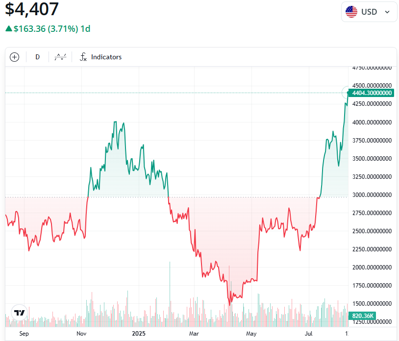 Корпорації та фірми, що торгуються, все частіше приймають ефір як вторинний резервний актив, який протягом останнього тижня зросла на 21%, щоб торгувати на рівні 4 408 доларів на момент написання.