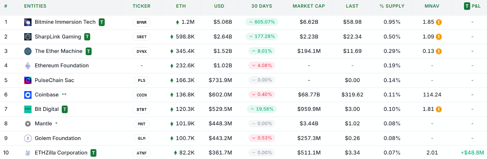Bitmine – найбільший у світі корпоративний власник Ether з 1,2 мільярда ETH на суму 5 мільярдів доларів за свої книги, а за ним Sharplink з 598 000 ефірних коштів на суму 2,64 мільярда доларів, показують дані стратегетів.