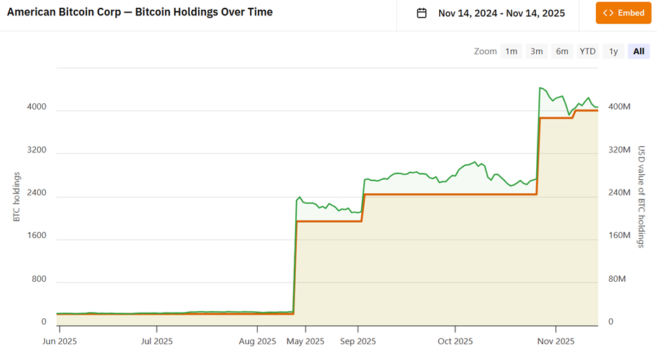 Трамп принаймні реалізує свою філософію на практиці. Майнінгова компанія American Bitcoin, яку він очолює, яка вийшла на біржу на початку цього року шляхом зворотного злиття з Gryphon Digital Mining, додала понад 3000 BTC у третьому кварталі, довівши свої загальні активи до понад 4000 BTC.