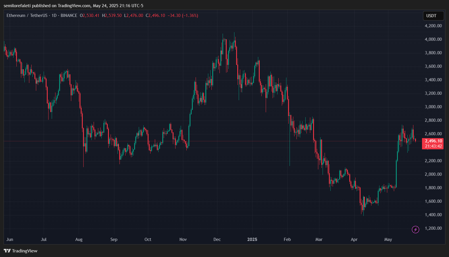 ЕферіумТоргівля ETH на рівні 2496 доларів на щоденній торговій діаграмі |Джерело: діаграма Ethusdt на TradingView.com