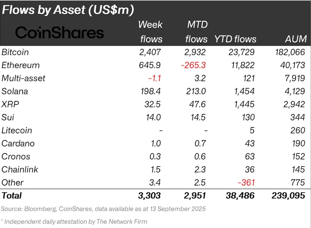 Глобальна криптовалюта ETP минулого тижня побачила 3,3 мільярда доларів припливу, піднявши загальні активи під управлінням (AUM) до 239 мільйонів доларів, що наближається до рекордного високого, що спостерігається в серпні. Минулого місяця Cryptocurrency ETPS побачив високий рівень AUM за весь час у розмірі 244 мільярдів доларів.