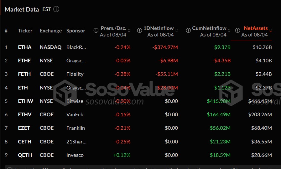 Дані Sosovalue показують, що менеджер активів Blackrock’s Ishares Ethereum Trust (ETHA) в понеділок отримав найбільший удар, побачивши майже 375 мільйонів доларів чистих відтоків. ETF все ще має кумулятивний чистий приплив у розмірі 9,3 мільярда доларів та чисті активи – 10,7 мільярда доларів.