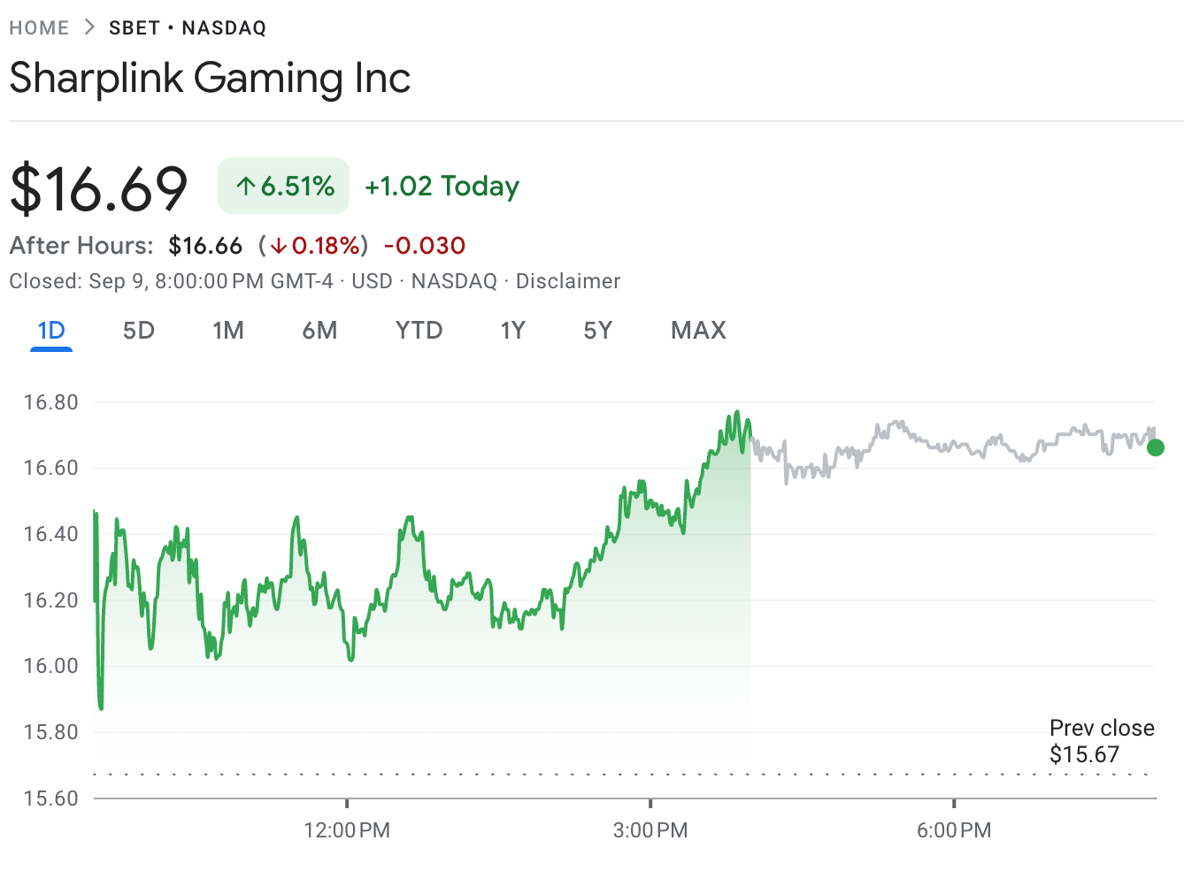 Акції в Sharplink Gaming (SBET) закрили торгівлю в середу на рівні 16,69 долара, що на 6,59%, що перевищує 6,59%, повідомляє Google Finance.