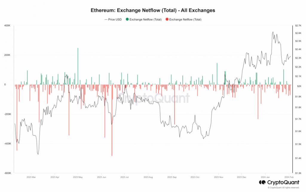 За даними аналітичної фірми блокчейну IntoTheBlock, минулого тижня ETH на приголомшливі 500 мільйонів доларів вийшли з бірж, що призвело до загального відтоку 1,2 мільярда доларів за весь січень. Це значний зсув у порівнянні з попередніми місяцями, що викликає сумніви щодо мотивації цієї тенденції.