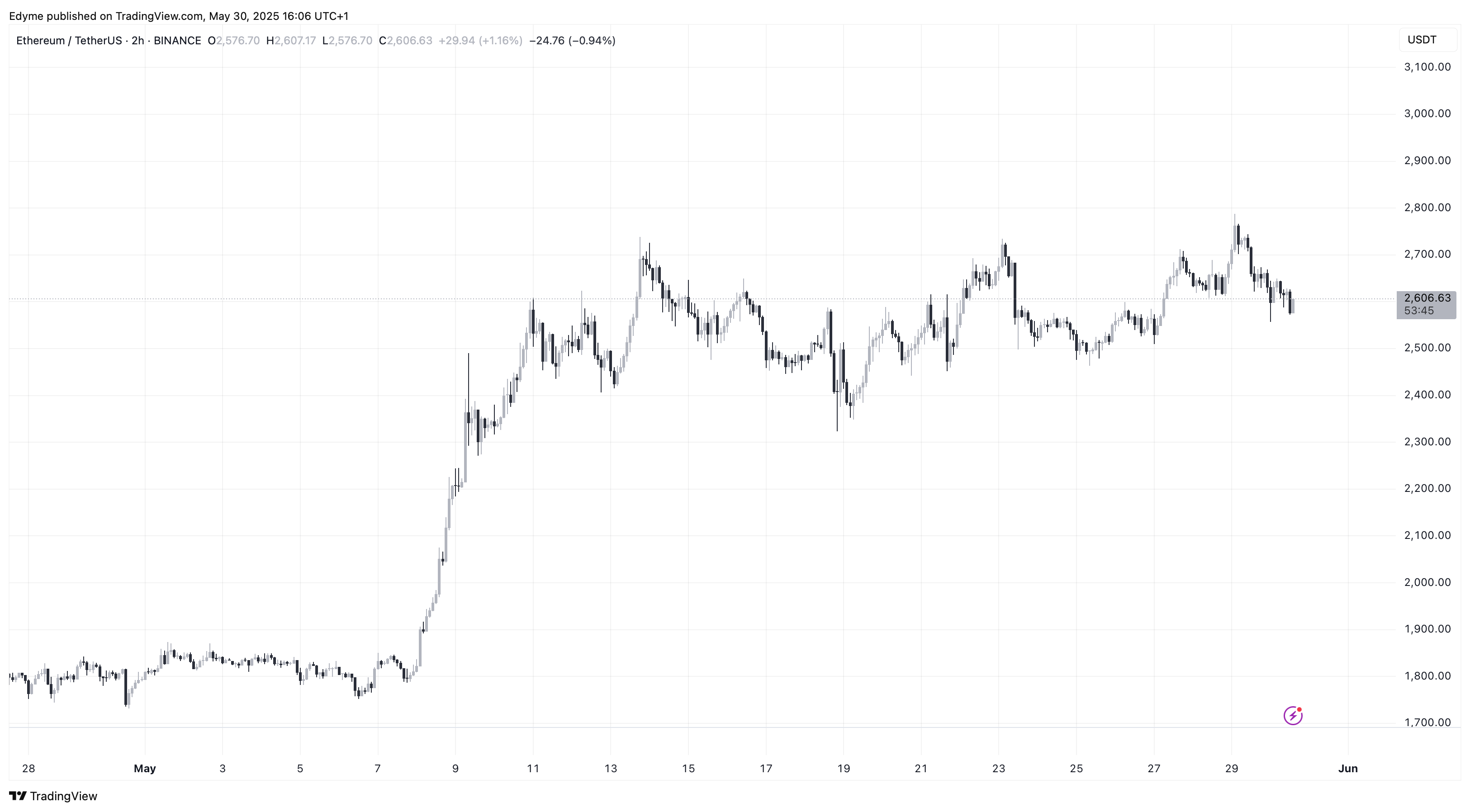 Ethereum (eth) Pice Chart на TradingViewЦіна ETH рухається вгору на 2-годинній діаграмі. Джерело: ETH/USDT на TradingView.com