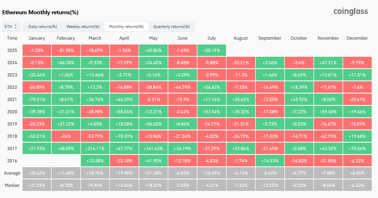 Це відзначає перший раз, коли ефір давав щомісячну віддачу 50% або більше за один місяць з липня 2022 року, коли ETH збільшився на 56,62%, повідомляє Coinglass.
