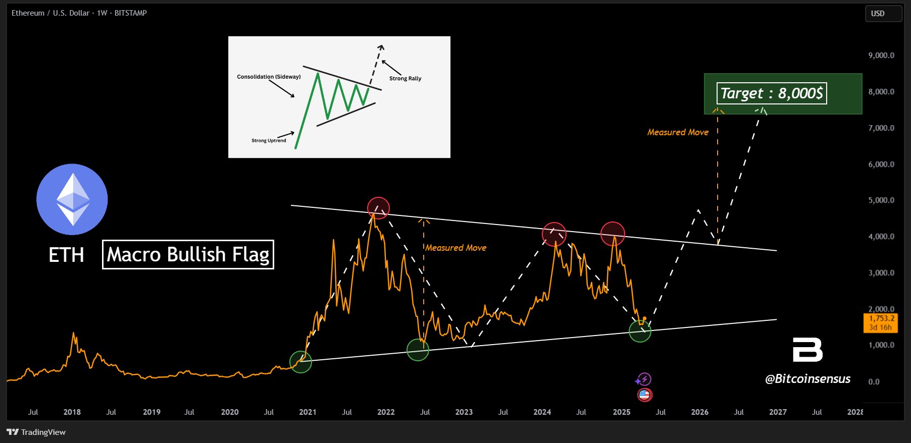 Окрім даних про ланцюг, учасники ринку також аналізують Ethereum з технічної точки зору. Аналітик криптовалют на X, що працює під псевдонімом “Bitcoinsensus”, звернув увагу на багаторічну схему “бичачий прапор”, що утворюється на діаграмах ETH з 2021 року.