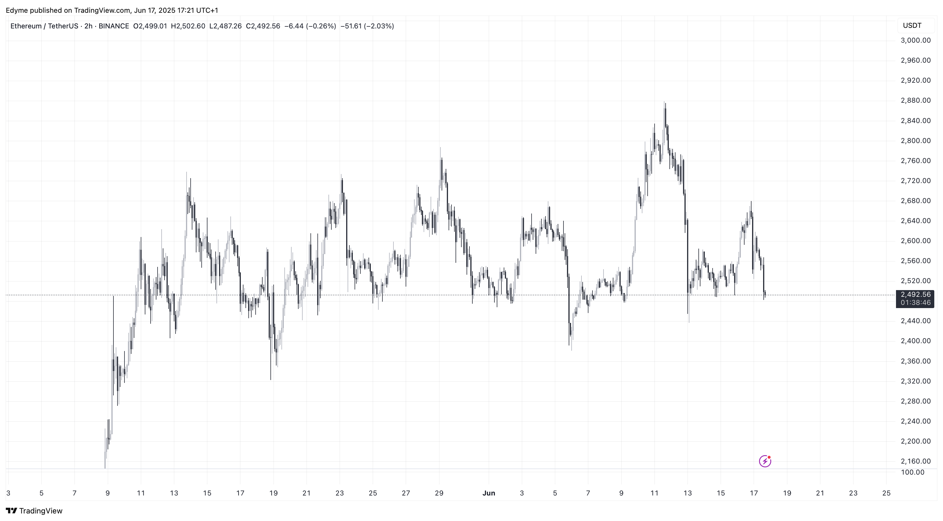 Ethereum (ETH) пережив помітний відкат після короткого періоду вгору імпульсу на початку цього місяця. Актив, який піднявся на рівень 2800 доларів у середині червня, з тих пір знизився на 8,7% за останній тиждень, який зараз торгується приблизно в розмірі 2498 доларів.