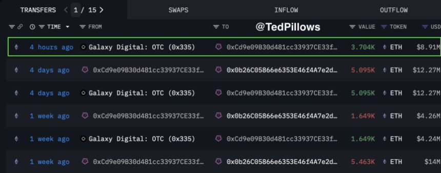 Додавання палива до цієї розповіді – це зростаюча тенденція накопичення китів. За даними Insights, якими поділився аналітики Тед Подушки, великий кит або інституційна організація щойно придбала ще 8,91 мільйона доларів ETH. Ця покупка додає приголомшливого 422 мільйонів доларів Ethereum, накопиченого за останні три тижні.