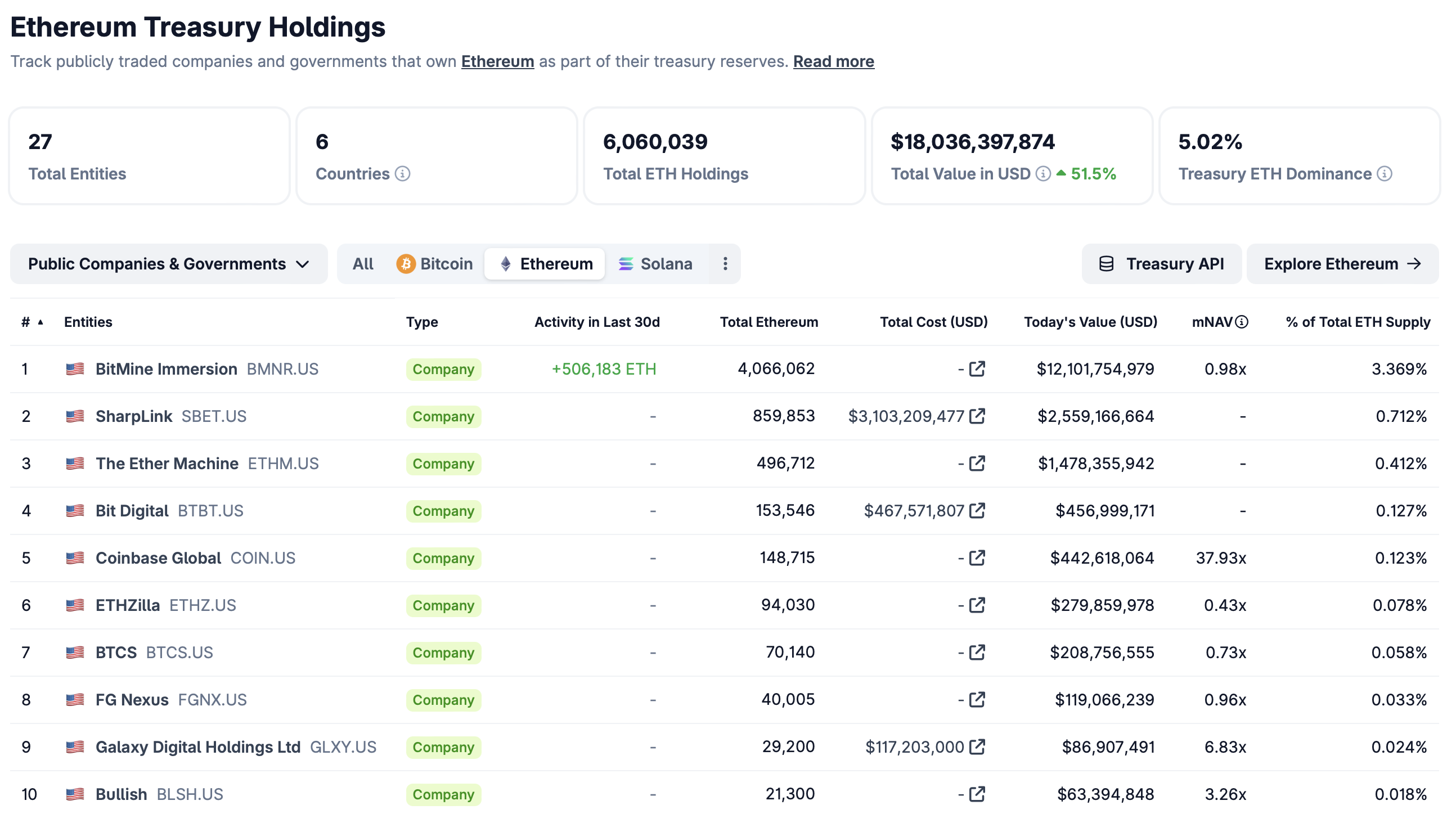Ефір оцінив аналогічний попит з боку інвесторів. Згідно з даними CoinGecko, 27 публічних компаній разом володіють близько 6 мільйонів ETH, що також становить приблизно 5% від обігу токена.