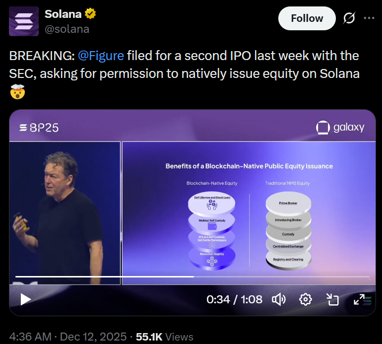 Виступаючи на конференції Solana Breakpoint, виконавчий голова Figure Майк Кегні сказав, що компанія подала заявку до Комісії з цінних паперів і бірж США (SEC) для запуску того, що він назвав «новою версією Figure equity на публічному блокчейні», зокрема Solana.