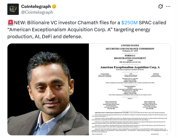 Ранній інвестор біткойна та мільярдер Чамат Паліхапітія подав заявку, щоб зібрати 250 мільйонів доларів компанії «Корпорація American Exteminism Accipition Corp A», орієнтована на децентралізовані фінансові, AI, енергетичні та оборонні сектори.