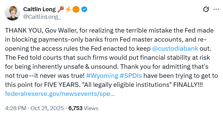 «ДЯКУЮ ВАМ, губернаторе Уоллер, за те, що ви усвідомили жахливу помилку, яку допустив ФРС, заблокувавши платіжні банки в головних рахунках ФРС і повторно відкривши правила доступу, які ФРС встановила, щоб не допустити @custodiabank», — написала Кейтлін Лонг, засновник і генеральний директор Custodia Bank, у дописі X у вівторок, додавши:
