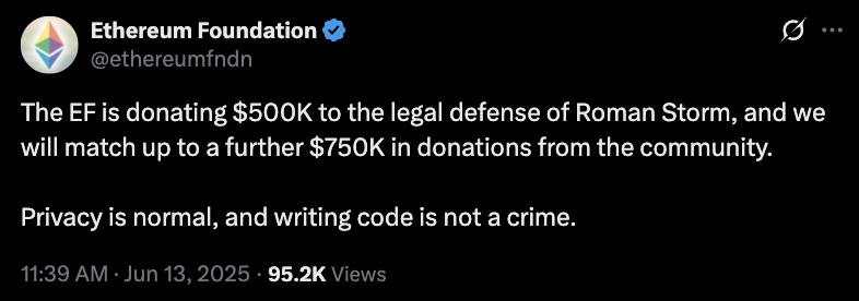 Фонд Ethereum заявив, що буде пожертвувати 500 000 доларів на юридичну оборону співзасновника та розробника Roman Storm, який стикається з звинуваченнями, пов’язаними із звинуваченнями, що він змовився за керування послугою змішування криптовалют як неліцензованого передавача грошей.