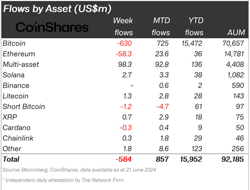Біткойн становив більшість відтоків цього тижня, 630 мільйонів доларів залишив інвестиційні товари BTC. Незважаючи на значне переміщення коштів із довгих позицій біткойна, короткі продукти Bitcoin також зафіксували відтоки на загальну суму 1,2 мільйона доларів.