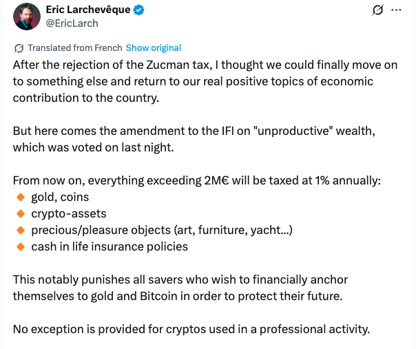 Ерік Ларшевек, співзасновник виробника криптовалютних гаманців Ledger, заявив у суботу, що поправка «карає всіх вкладників, які бажають фінансово прив’язатися до золота та біткойнів, щоб захистити своє майбутнє».