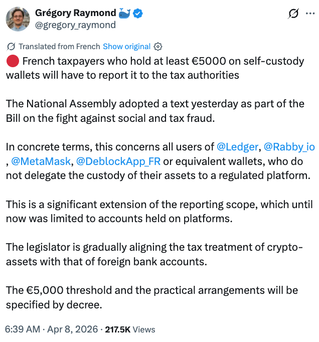 За словами Грегорі Реймонда, засновника місцевого видання The Big Whale, 7 квітня Національна асамблея Франції прийняла положення в законопроекті про боротьбу з шахрайством, яке вимагатиме щорічної звітності про розміщені на власному хості криптовалютні гаманці на суму понад 5000 євро.