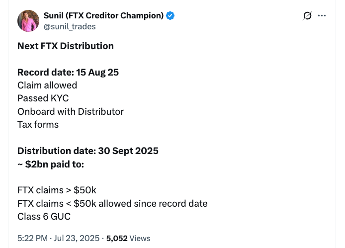 Торгівля FTX Trust та Beborror FTX у середу оголосила, що очікується, що наступний розподіл розпочнеться 30 вересня, і заявив, що вони визначать власників претензій на основі дату запису від 15 серпня.