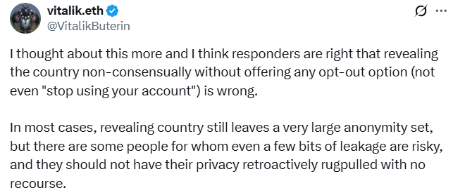 «Я думав про це більше, і я думаю, що респонденти мають рацію, що розкривати країну без згоди, не пропонуючи жодних варіантів відмови, навіть не припинення використання свого облікового запису, є неправильним», — пізніше сказав Бутерін.