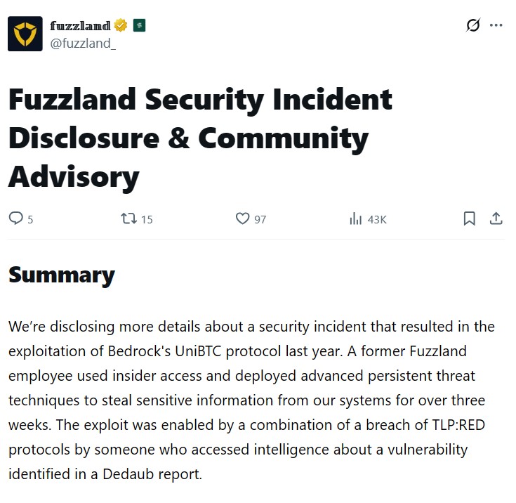 Smart Contract Analytics Platform Fuzzland повідомила, що колишній працівник відповідав за експлуатацію в розмірі 2 мільйонів доларів, націлений на протокол Unibtc Bedrock у вересні 2024 року.