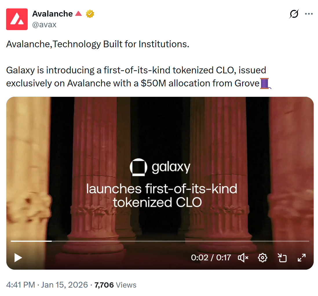 Згідно з повідомленням у четвер, угода, відома як Galaxy CLO 2025-1, укладена на Avalanche і наразі профінансувала кредити на суму приблизно 75 мільйонів доларів США. Трансакція ґрунтується на виділенні приблизно 50 мільйонів доларів від Grove, інституційного кредитного протоколу в екосистемі Sky, раніше відомого як MakerDAO.