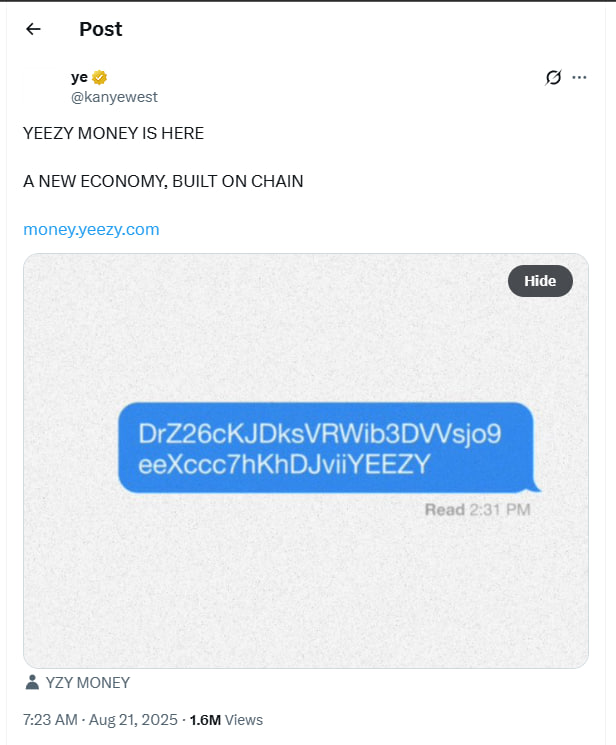 Захід оголосив маркер на X, назвавши його частиною “нової економіки, побудованої на ланцюзі”, з Yzy, призначеним для підживлення транзакцій у запропонованій йому запропонованій системі “Yzy Money”.