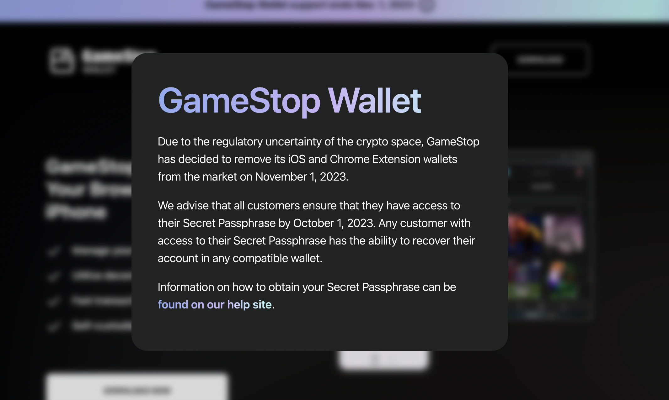 У повідомленні, опублікованому на своєму веб-сайті, GameStop повідомляє, що гаманці iOS і Chrome Extension більше не будуть доступні з 1 листопада, порадивши користувачам забезпечити доступ до своїх секретних парольних фраз до 1 жовтня. Гаманці, запущені в травні 2022 року,дозволяють користувачам керувати криптовалютами та незамінними токенами, або NFT.