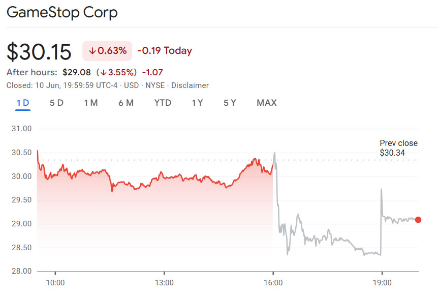 Акції GameStop знизилися на понад 3,5% у торгівлі після годин у вівторок, знизившись до трохи вище 29 доларів, повідомляє Google Finance.