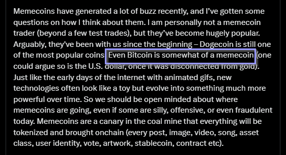 Як і мем -валюти, Армстронг зазначив, що цінність біткойна по суті походить від популярної чи колективної віри. Він пояснив, що на відміну від звичайних активів, біткойн не має притаманного значення, пов’язаного з фактичними об’єктами або прямим використанням. Натомість його цінність коливається суспільним довірою та спільним сприйняттям його значущості.