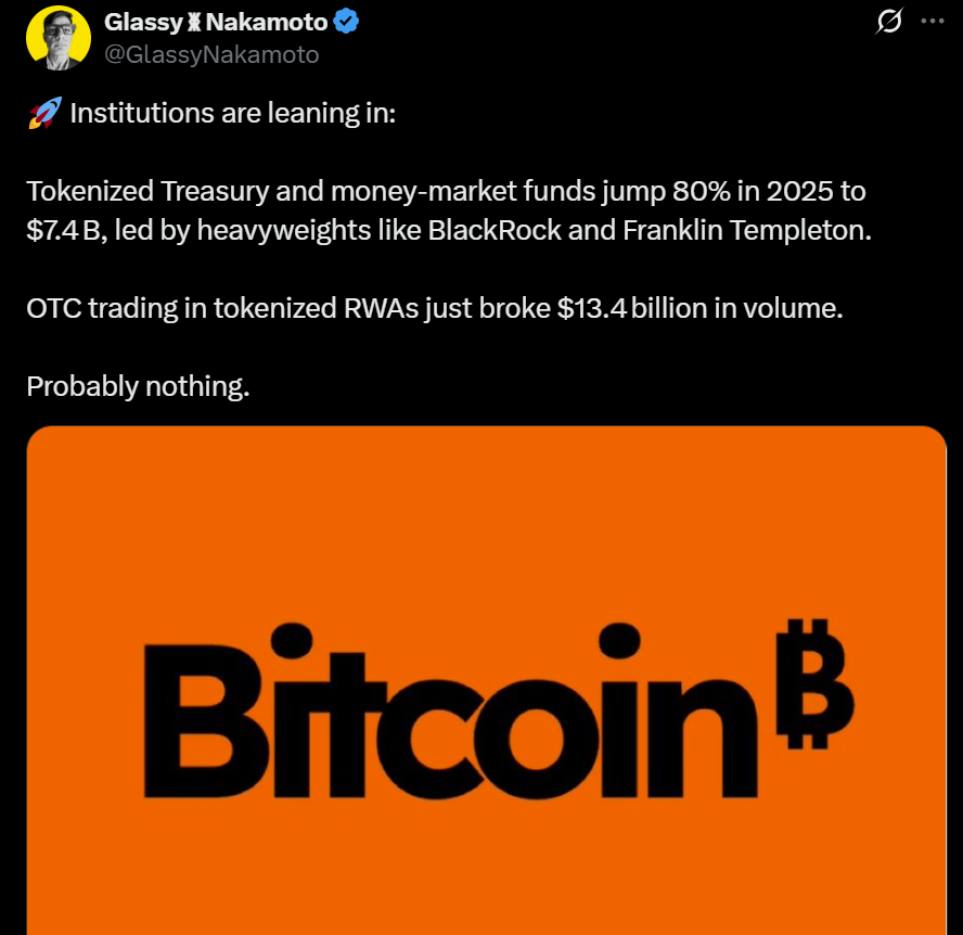 Він зазначив, що трильйони доларів у стабільних стабільах, що не мають інтересу, готові до вступу в цифрові фінанси.”Інституційні власники не збираються сидіти на холостому ходу, знецінюючи активи. Вони вимагатимуть дохідності – і інфраструктуру, яка робить доступ до неї […] сумісними”, – сказав він, додавши: