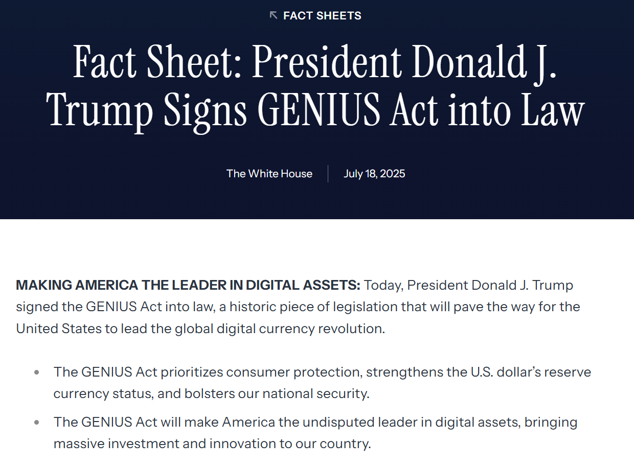 Незважаючи на те, що геніальний акт надає новоспеченій легітимності стаблекуїнам – і широко цифровим валютам – “наступна фаза цифрових активів зосереджена на токенізації активу”, – написала Сандра Валечек, член блокчейна та дивізіону цифрових активів Всесвітнього економічного форуму.