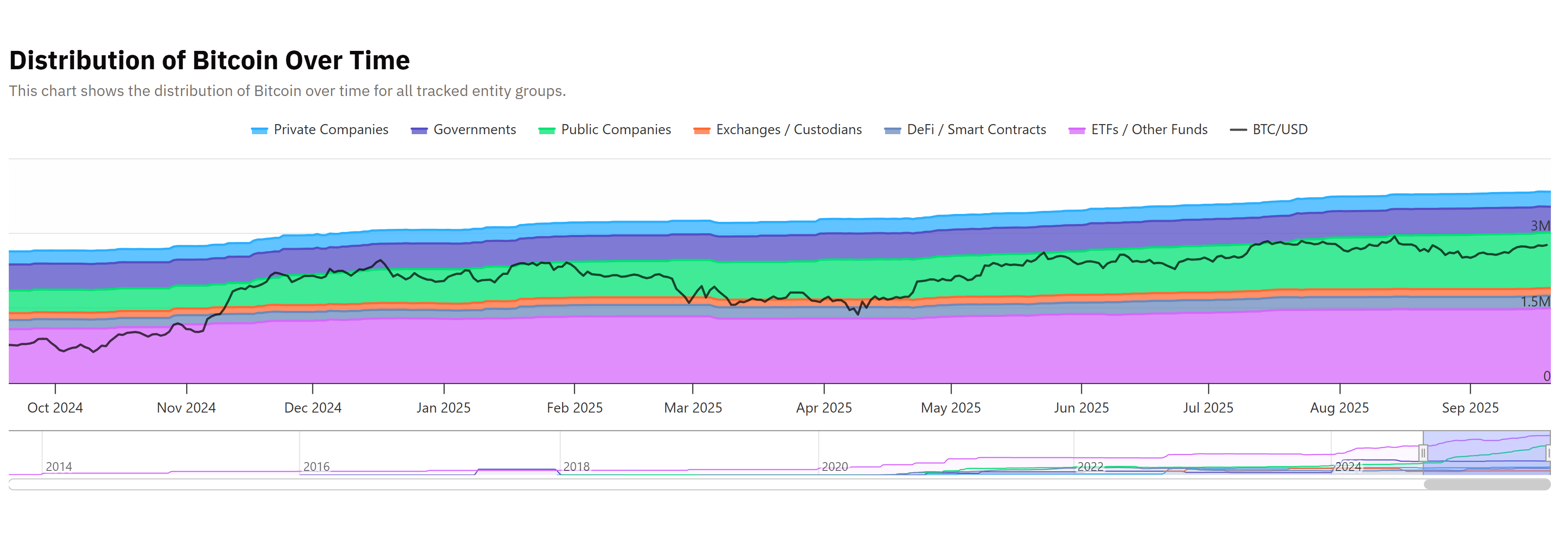 За даними Sosovalue, Spot Bitcoin ETF мають комбіновані активи в розмірі 152,31 мільярда доларів, що становить 6,63% загальної ринкової капіталізації Bitcoin. На відміну від цього, державні компанії розміщують 1111,225 біткойна (BTC) на своїх балансах, вартістю 128 мільярдів доларів, повідомляє BitcoinTreasuries.net.