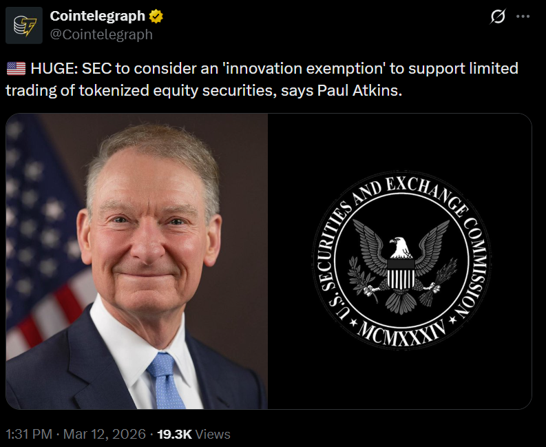 Незважаючи на те, що у промові розглядалися ширші регуляторні питання, Пірс також вказав на зростаючу дискусію навколо токенізованих цінних паперів і фінансової інфраструктури на основі блокчейну.